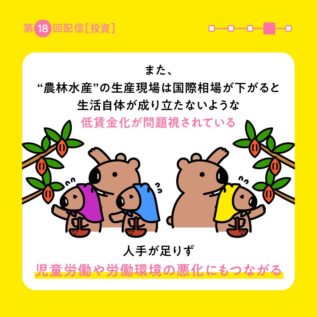 もし私たちが安さだけを基準に選び続け、現地の生産者が持続できなくなってしまったらどうなるでしょうか。大好きなチョコレートが将来食べられなくなったり、産業そのものが衰退して日本への輸出が止まってしまったりする可能性すらあるのです。