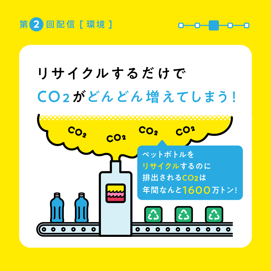 これほど大量に消費されるペットボトルも、リサイクルされれば問題ないと思うかもしれませんが、本当にそうでしょうか?実はリサイクルで年間1600万トンのCO2が排出されているそうです。